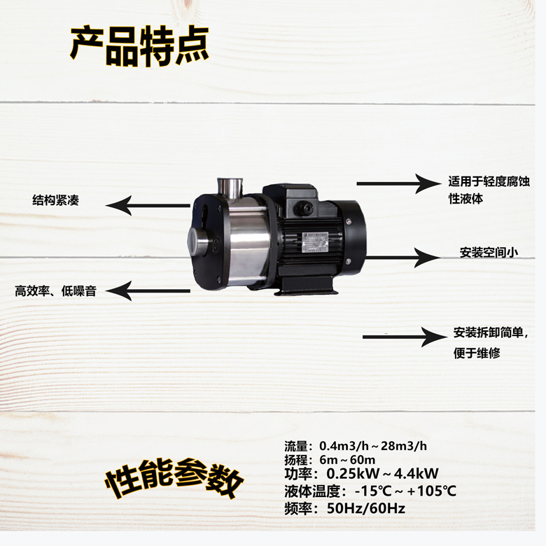 結(jié)構(gòu)緊湊、高效率、低噪音、適用于輕度腐蝕性液體、安裝空間小、安裝拆卸簡單,便于維修