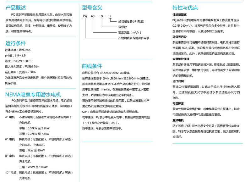 南方PQ不銹鋼噴泉專用潛水電泵,由潛水泵和噴泉用潛水電機(jī)組成。泵與電機(jī)通過(guò)聯(lián)軸器直接相連。適用于景觀音樂(lè)噴泉專用。